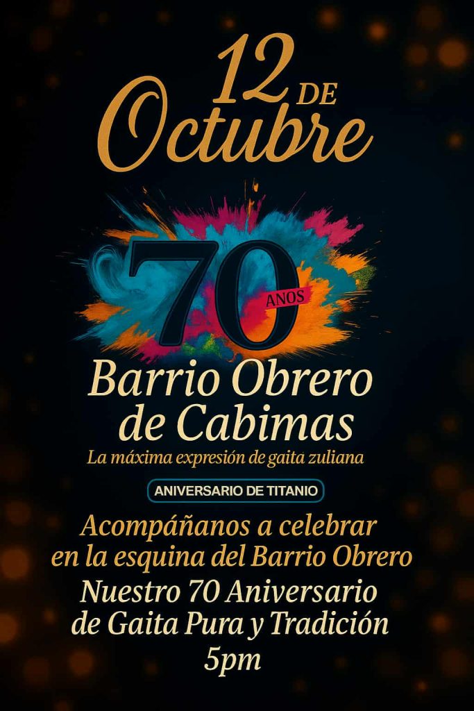Con un espectacular concierto que se montará en plenas calles del icónico Barrio Obrero de Cabimas, este próximo Domingo 12 de octubre la legendaria agrupación Gaitera que llevar el mismo nombre celebrará por todo lo alto su Aniversario 70.