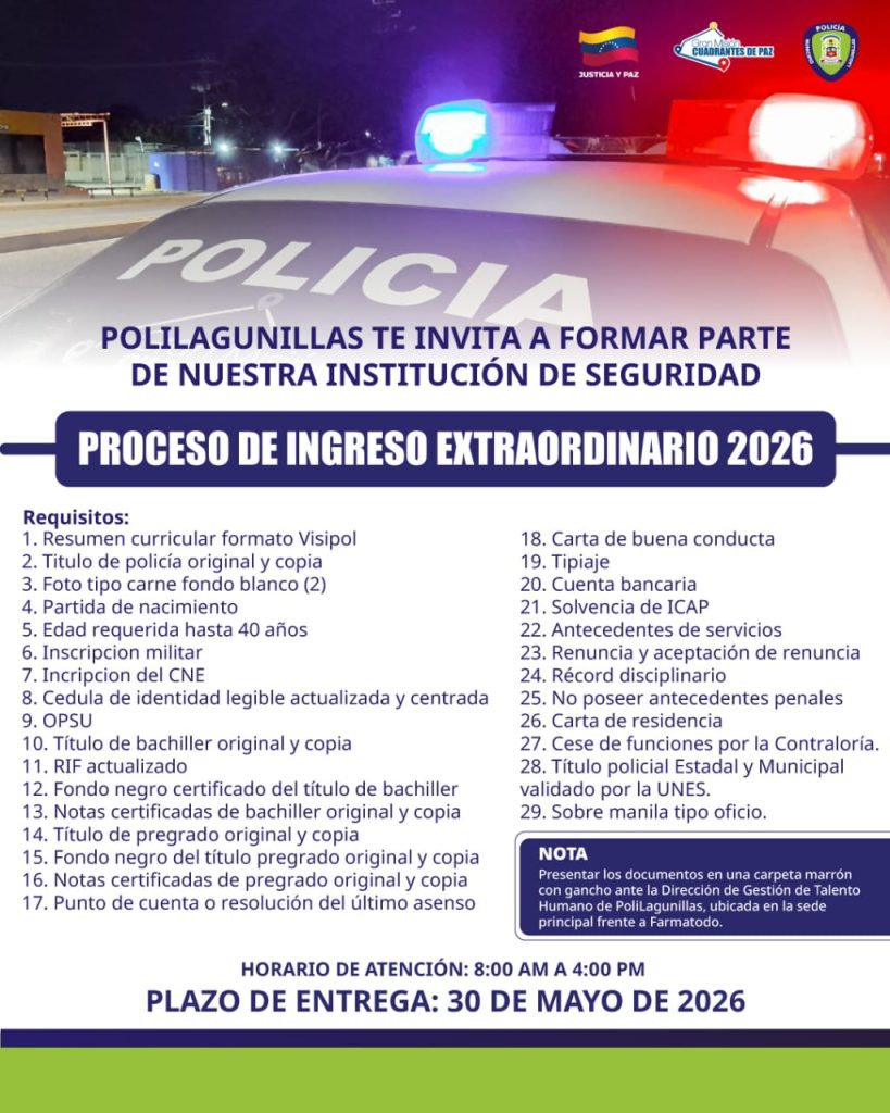 El Instituto Autónomo de Policía del Municipio Lagunillas ha anunciado formalmente el inicio de su II Proceso de Ingreso Extraordinario 2026, extendiendo una invitación a los profesionales del área de seguridad que deseen formar parte de esta institución, informó la I/J Yadur Rincones, directora de Gestión de Talento Humano, por instrucciones del comisario general Henry Barco.