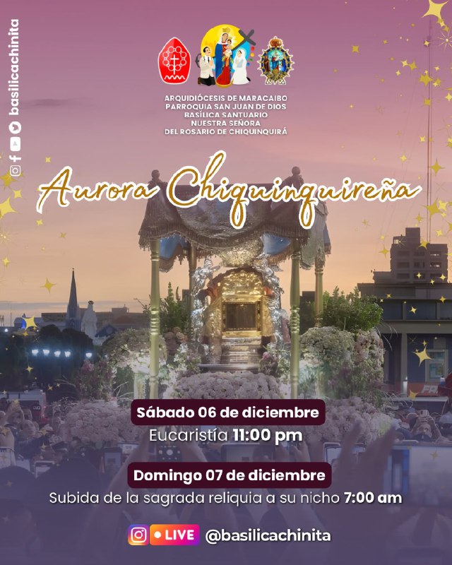 La Arquidiócesis de Maracaibo y la Parroquia San Juan de Dios, Basílica Santuario Nuestra Señora del Rosario de Chiquinquirá, convocan a todos los devotos de la Virgen de Chiquinquirá a participar en la tradicional “Aurora Chiquinquireña”, actividad que cierra las Fiestas Patronales 2025.