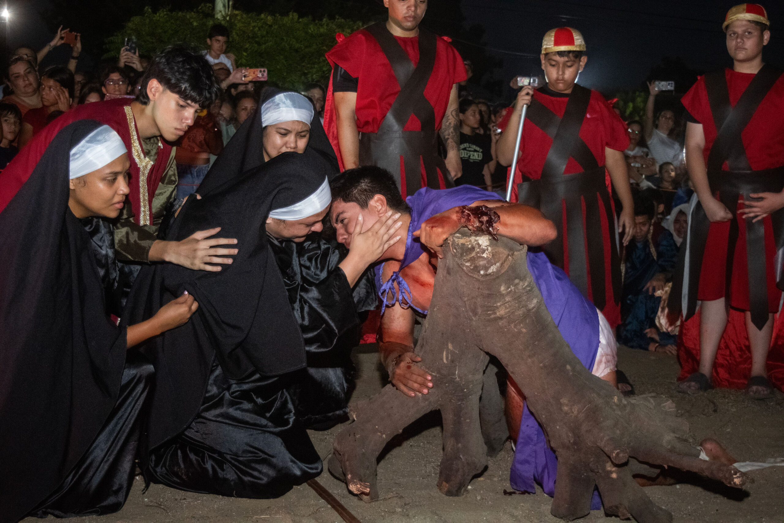 La representación, organizada principalmente por el grupo Jóvenes de Esperanza de San Pablo, contó con la participación activa de toda la comunidad parroquial, integrando a niños, adultos y feligreses que se sumaron a la escenificación de los pasajes de la pasión y muerte de Jesucristo.