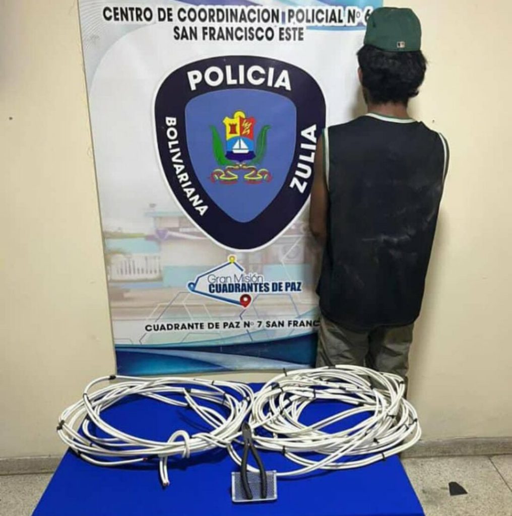 Un hombre señalado por la comunidad como azote, fue detenido por patrulleros del Cuerpo de Policía Bolivariana del estado Zulia (Cpbez), en el sector Plaza El Sol, municipio San Francisco, por hurtar el cableado eléctrico de un local comercial.