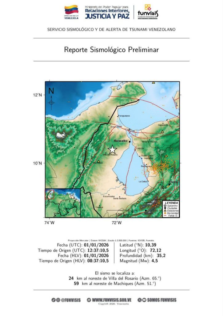 Un sismo de magnitud 4,5 se registró a 24 kilómetros del noreste de Villa del Rosario, estado Zulia; a una profundidad de 35,2 kilómetros, informó la Fundación Venezolana de Investigaciones Sismológicas (Funvisis).
