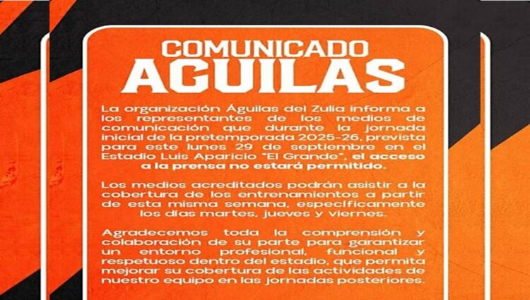Como lo había anunciado su directiva, las Águilas del Zulia inician sus actividades de pretemporada en las instalaciones del estadio Luis Aparicio ‘El Grande’ de Maracaibo, este lunes 29 de septiembre sin presencia de medios de comunicación, un aspecto que trajo polémica cuando el propio circuito rapaz elevó un comunicado informando al respecto.