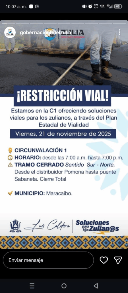 Circunvalación 1 (Municipio San Francisco): Sentido Norte – Sur (Desde el puente del Hospital Dr. Pedro Iturbe/General del Sur, hasta la entrada al Barrio Sierra Maestra), cierre total. De igual manera estará cerrado desde el distribuidor Pomona hasta puente Sabaneta.