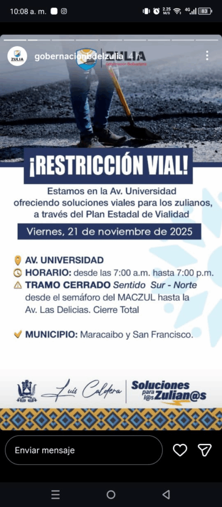 Avenida Universidad (Municipio Maracaibo): Sentido Sur- Norte, desde el semáforo del MACZUL hasta la avenida Las Delicias. Cierre total.
