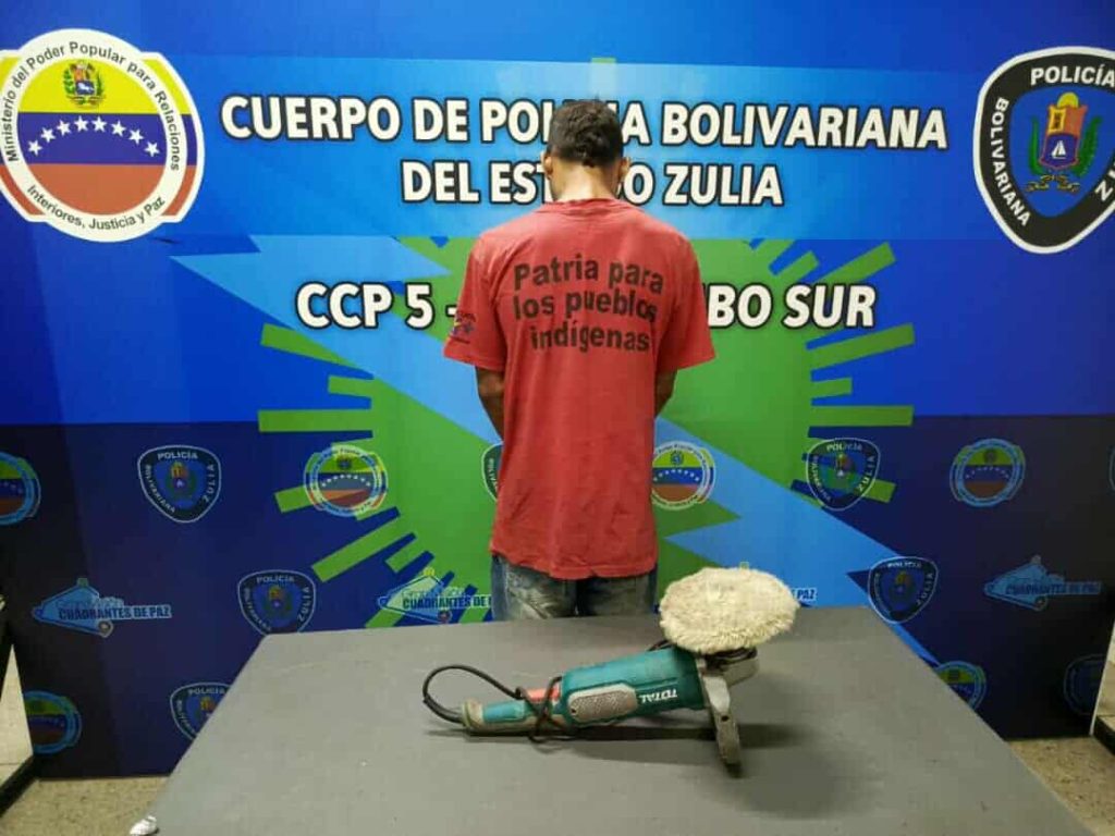 Por otro lado en el sector Los Haticos, parroquia Cristo de Aranza, municipio Maracaibo, fue aprehendido Elián José Morales Velázquez, de 23 años de edad, quien fue denunciado por el administrador de un pulilavado y hurtar un esmeril mopa pulidora.