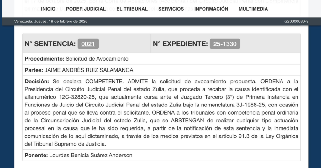 Este martes 18 de febrero, la Sala Constitucional del Tribunal Supremo de Justicia (TSJ) admitió la solicitud de avocamiento presentada por la defensa del empresario zuliano JAIME ANDRÉS RUIZ SALAMANCA y ordenó la paralización inmediata del juicio penal que se desarrolla en el estado Zulia.